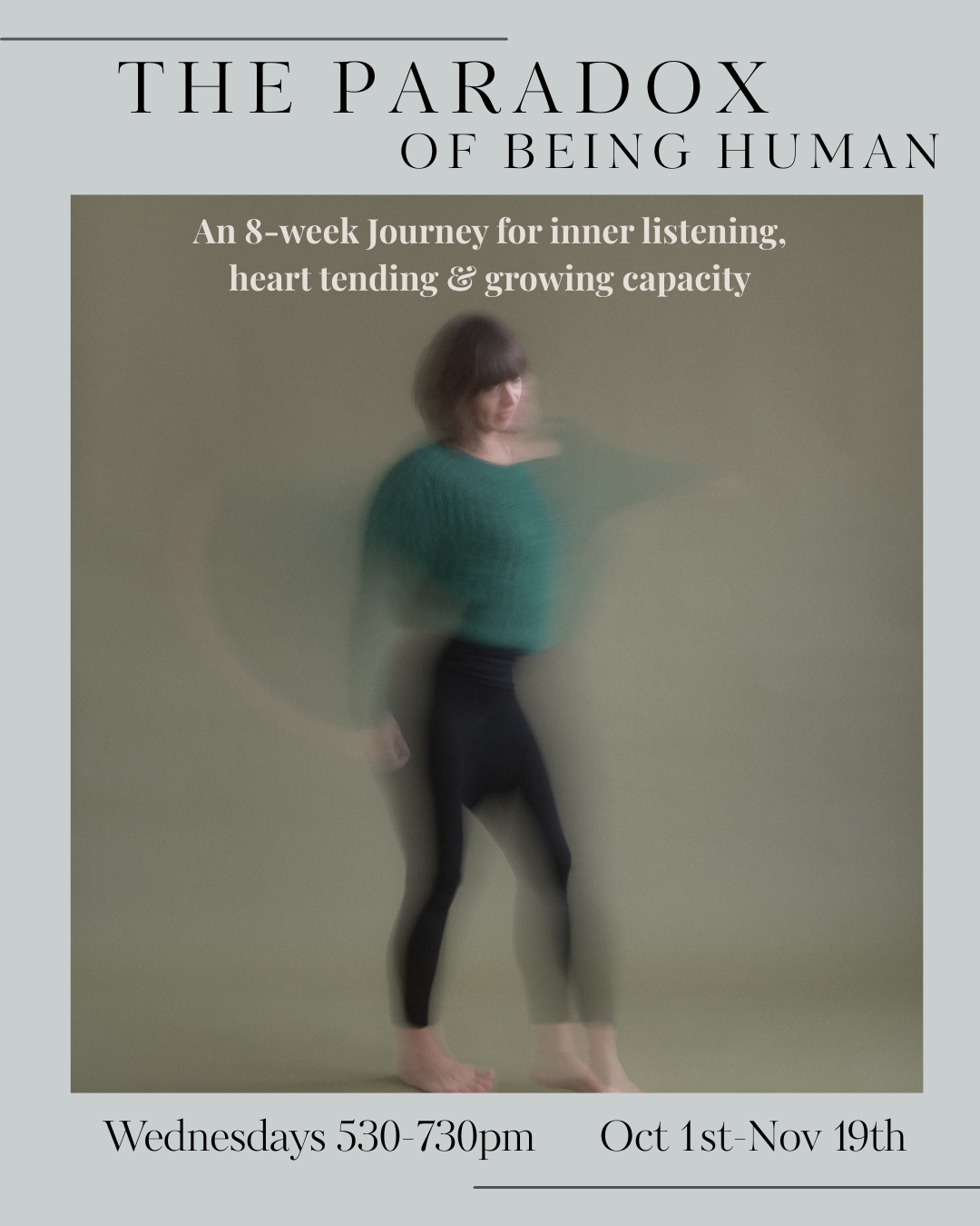 Each weekly 2-hour class will include a focused theme, group conversation, meditation, writing prompts, somatic movement practices, poetry and deep rest.