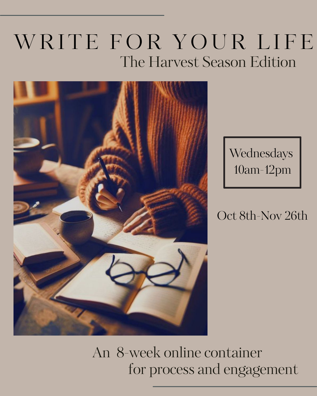 In addition to the weekly calls, there will be 4 x co-writing calls (dates TBD), to work on projects, hold each other accountable and expand on the work of our calls.